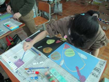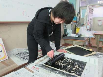 2学期から取り組み始めた版画が,完成に近づいています。星の子では,彫刻刀を使った木版画か,版木にボンドを広げて指や筆で線描きする版画か,自分に合った方法を選んで取り組みました。また,木版画を刷る時も,絵の具で多色刷りにするか,インクで刷るかを選びました。個性豊かな作品ができつつあります。