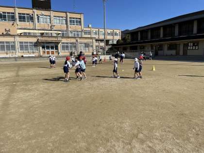 1年生では体育でパスゲームをしています。5人程度のチームでパスを回しながら最終的にゴールマンにパスができると1点というルールです。見方がキャッチしやすいように声掛けをしたり,パスを受けやすいように,横に動いたり,チームで作戦を考えながら楽しく試合を行っています。