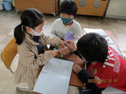 辺は12本だからストローは12本。3種類の長さが4本ずつ必要なことみんなで見つけてから,グループで協力してはこの形を作りました。