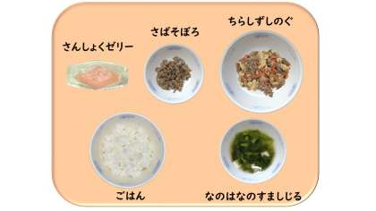 京都府の丹後地方では,ちらしずしの上にさばそぼろをのせて食べる「ばらずし」が有名です。今回,給食でも,ちらしずしの具をごはんに混ぜ,さばそぼろをちらしずしの上にのせて食べました。