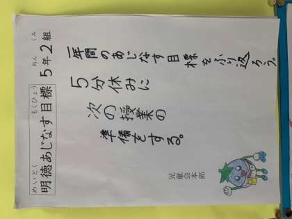 休み時間に時計を見て過ごしていたり,周りに声をかけたりと目標を意識している姿がさっそくみられています。5年生として過ごす残り少ない時間を大切に,6年生に向けて頑張っていきたいと思います。
