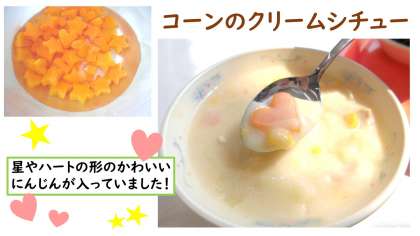 「コーンのクリームシチューは,コーンがシャキシャキしておいしいなと思いました。」