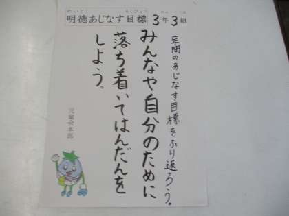 3年3組では、「みんなや自分のために、落ち着いてはんだんをしよう」という3月のあじなす目標をたてました。