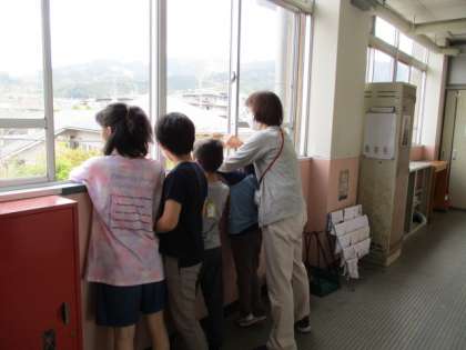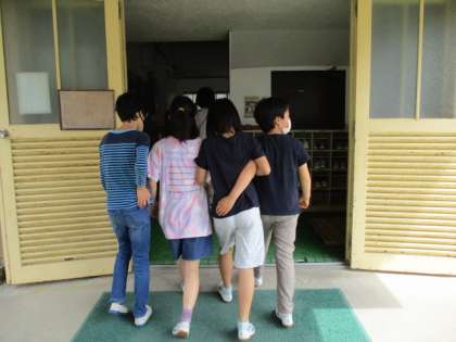 新たに星の子学級の一員となった友達への学校紹介も兼ねて,皆で様々な教室を見て回りました。体育館,職員室,コンピューター室等を巡り,三階へとたどり着いた際には窓の外の景色を一緒に眺めました。「高いねー!」「怖いね!」と子供たちのはしゃぐ声が印象に残っています。