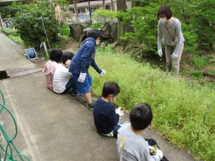 星の子の子供たちと手分けをして,覆い茂った雑草を引っこ抜き,その後はスコップを用いて土を柔らかくほぐしました。「誰が一番採れたかな?」と取り除いた雑草の量を競う子や,「軍手濡れた!」と湿った土に顔をしかめる子など反応は様々。中には,大きなナメクジを手に乗せて可愛がる子もいました。身近な自然に,多様なリアクションを見せてくれる子供たちを微笑ましく思います。