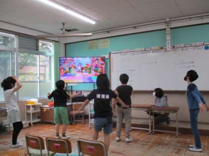 学級のリーダーを中心に,各々が歌いたい,踊りたい曲を選びました。「勇気100%」をみんなで歌った後は,「チェケマッチョ」「ツバメ」など合計4曲を全力で踊りました。映像を見てダンスを忠実に再現する子,オリジナルの振付けを披露する子など,それぞれが自分なりの楽しみ方をしていました。