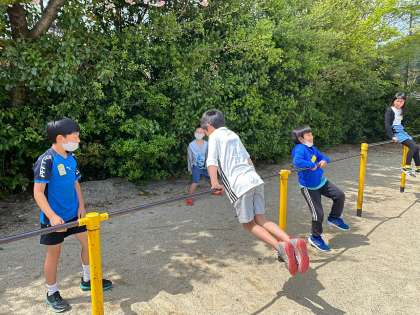鬼ごっこをしたり,鉄棒をしたりたくさん外で遊んでいます。