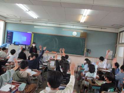 強弱記号のpやmfはどのような意味で使われるか尋ねられると多くの手が挙がりました。