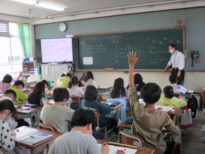 算数科「体積」の授業を見ていただきました。緊張した中でも一生懸命に考える姿を見ていただけたと思います。