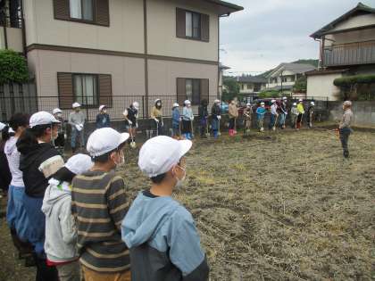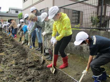 天候が怪しかったですが,めいとく学習では,あぜきりを行いました。スコップを片手に一生懸命に活動を行いました。畑の先生にも初めてと思えないほど上手だとほめていただきました。土台作りの第一歩,今後の活動が楽しみです。