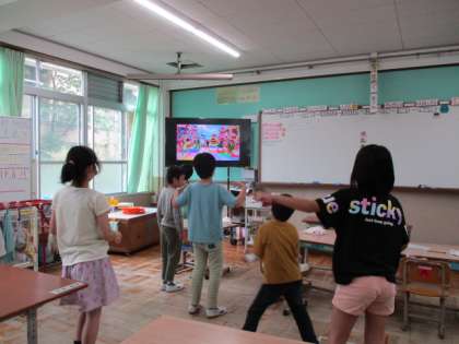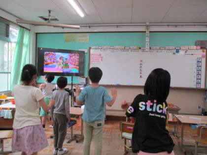 5時間目の音楽では,5月17日に開かれる「なかよしになろうね会」に向けて「忍者の50音」と「ツバメ」のダンス練習をしました。