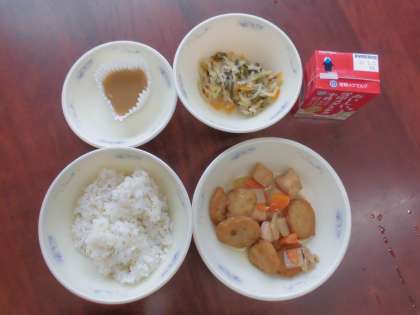 「平天とこんにゃくの煮つけがあまくて,こんにゃくはつるんっと口の中に入るので食べやすかったです。切干大根の煮びたしがしゃきしゃきとしておいしかったです。」