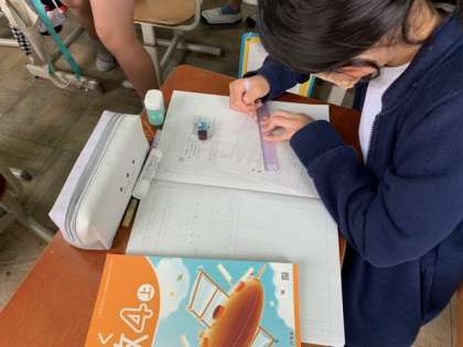 そして,次は実際に自分たちで折れ線グラフを書いてみました!目盛りのつけ方に気をつけながら,一つ一つ点をつなぎました。