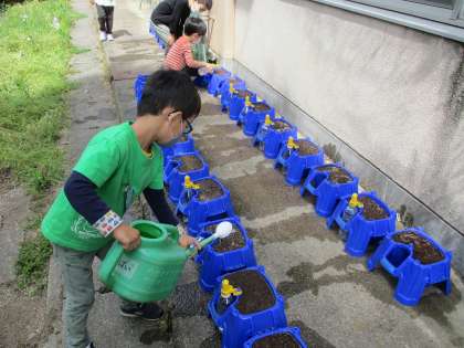1・2時間目にまくと,さっそく中間休みに「見に行っていい?」とうれしそうに見に行く子どもたち。芽が出るのが楽しみですね。