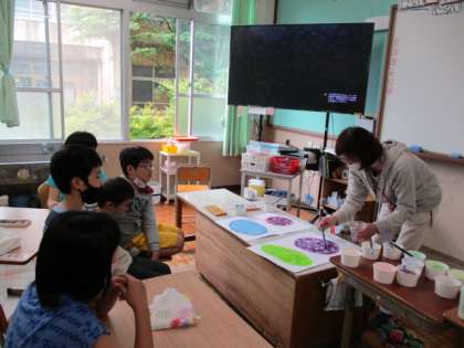 星の子の子供たちは,ハケやローラーを使って,思い思いにアジサイを描いていきました。色遣いにそれぞれのセンスが現れていて素敵でした。