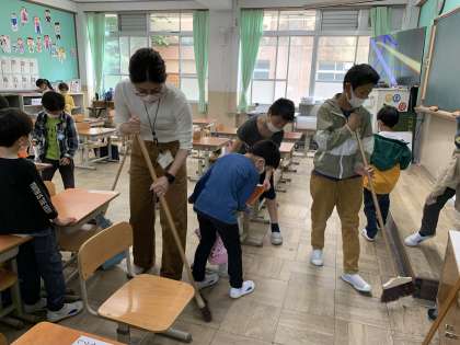 実は,夏までは6年生が1年生の教室を掃除します。また,段階を踏んで1年生に掃除の方法を教えていきます。