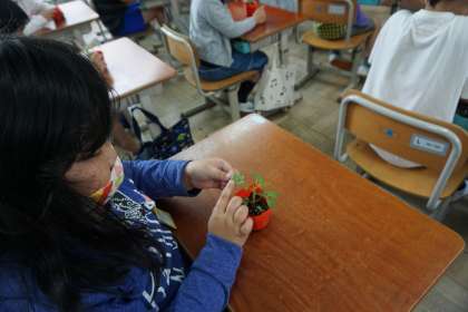 生活科「ぐんぐん そだて」では,たくさんの野菜を育てています。今日はその中のミニトマトの苗をじっくりと観察して,観察カードを書きました。その際ただ見るだけではなく,手で触ってみたり,においをかいでみたりすることで,ギザギザした葉の形やふさふさした手触りに気づくことができました。「ミニトマトのにおいがする!」といった発見もあったようです。