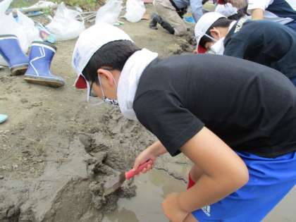 以前「あらごなし」で集めた泥をあぜに塗込み,田んぼの保水性を良くすることがねらいです。星の子の5年生は泥だらけになりながらも,おいしいお米作りのために一生懸命あぜを整えていました。