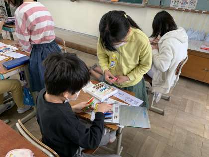 今日はたてわり活動や町別児童集会の時に1年生が首からかける名札づくりをしました。自分のたてわりグループの1年生へ向けて心を込めて作りました。みんなから名前を憶えてもらって,素敵な毎日を過ごしてほしいです!