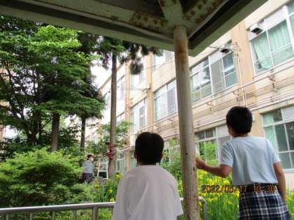 「何してるんですか?」木にいる白神さんを発見して声をかけていた6年生。「危ないことがないように木を切っているんだよ。」管理用務員さんの仕事がさまざまです。