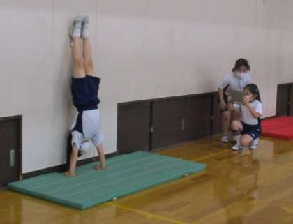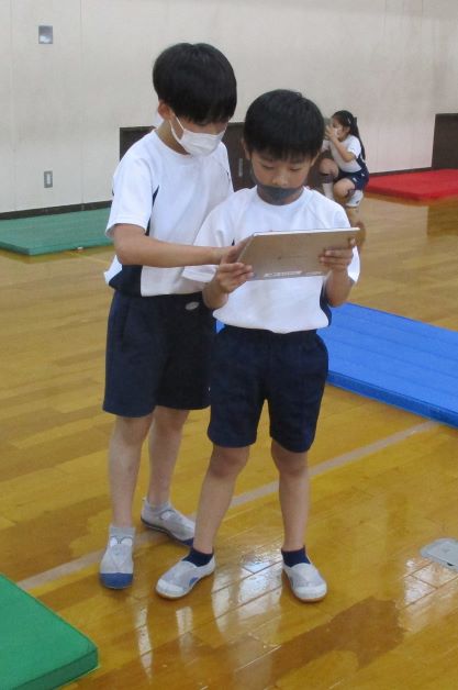 体育「マット運動」の学習で,タブレットPCの動画を使って,自分の動きを友だちにとってもらいました。自分がなおしていかなめればならないところはどこか,わかったでしょうか。おたがいにアドバイスしながら,上たつしていきたいですね。