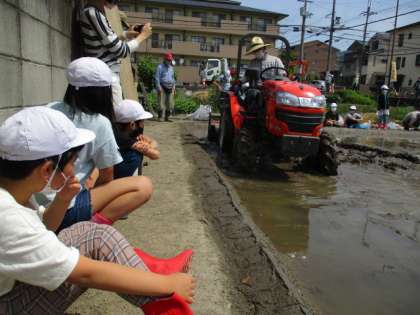 本ごなしは,田んぼに肥料を撒いた後,再度田んぼをかき混ぜる工程です。星の子の5年生は,トラクターに乗って田んぼを往復する先生方を真剣な眼差しで見ていました。