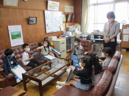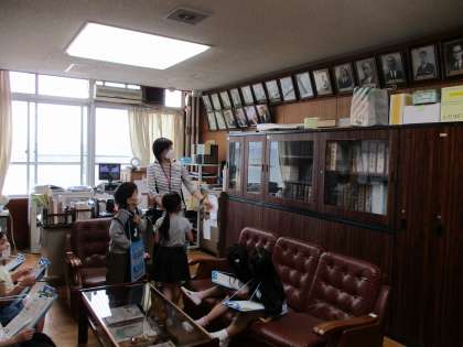 1年生の生活科「なかよしいっぱいだいさくせん」では,校長室に行き,気になった物について校長先生に質問をしていました。「たくさん賞状がある」や「どうしてたくさん写真が飾られているのかな」とそれぞれの気づきや発見がありました。