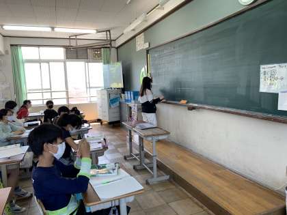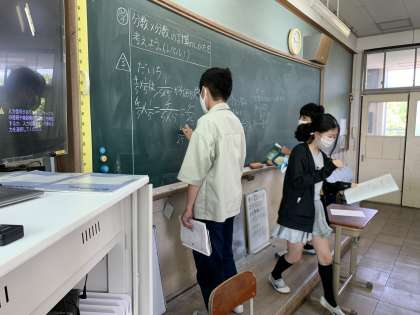 分数のかけ算の学習をしています。計算方法自体は簡単ですが,「どうしてそうなるのか」というところに焦点を当てて授業を進めています。理解を深め,幅広い考え方をできるようになってほしいと思います。