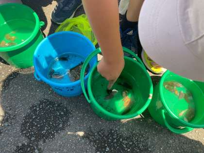 各クラス,めいとく学習で岩倉川へ生き物探しに行っています。