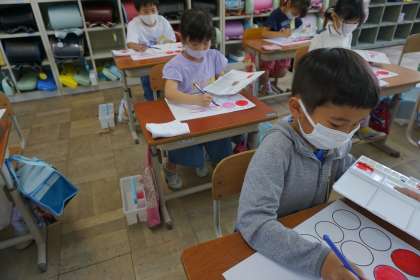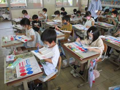 図画工作科の学習で,初めて絵の具を使いました。筆洗やパレットの使い方を学習しました。水の量を調節することで,色が変化していく様子を楽しみました。水の量を増やすことで,だんだん透明度が増していく様子に「きれい〜!」と感動している姿も見られました。