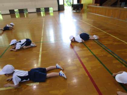 1年生の体育科では,虫の動きを考えて,それぞれで虫になりきる活動をしました。