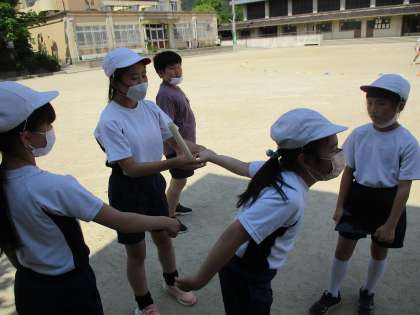 あとは,どれだけペアやチームで話合いを進めるかでバトンパスの精度が変わってくるため,手の上げる位置なども確認しながら進めました。