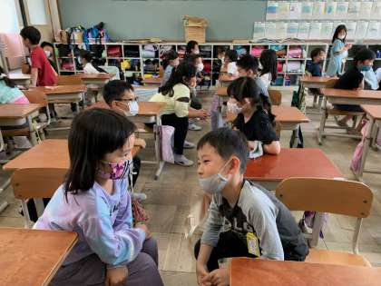 朝の帯時間を活用して,「にこにこタイム」の学習が始まりました。今日は初回ということで,AチームとBチームの2チームに分かれて,Aチームが質問をして,Bチームがその質問に対して回答するといった形で対話を進めていきました。1分間という短い間ですが,役割を交代しながら進めることで,友だちの新たな一面を知ることができたようです。
