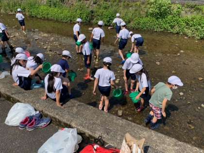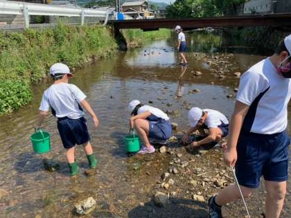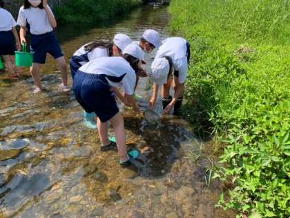 1組も岩倉川に生き物の様子を調べに行きました!水面に近づいて,川の中を覗き込むように探していました。手づかみで魚を捕まえる姿には驚きました!