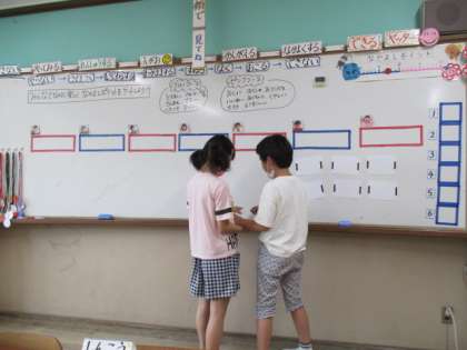 クラスの「なかよしポイント」にテーマを当て,どのような言動がクラスの仲を深めるのかについて話し合いました。その後は「めくってポン!(神経衰弱)」を行い,先ほど話し合いの中で出た「がんばれ」や「おしい!」などの優しい声掛けを意識してゲームを進めました。「司会」「順番」など一人一人に役割も設け,子ども達は自分の仕事をきちんと果たしていました。