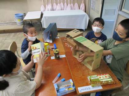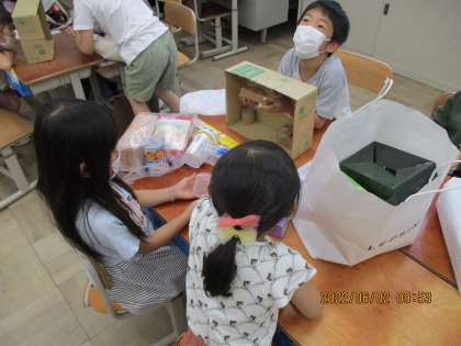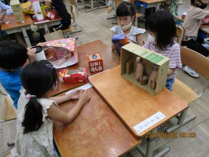 1年生の算数科では,友だちが選んだ箱の形と同じ形を,手で触って見つける活動をしました。「角が四つあるからこれ!」と楽しそうに活動する様子が見られました。