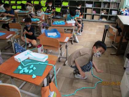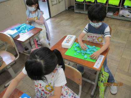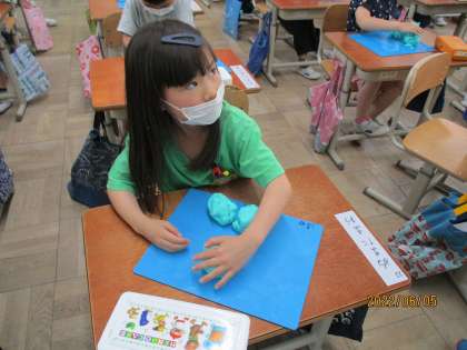 まずはねんどの体操をしてやわらかくし,その後ひも状にしたねんどで作品を作りました。