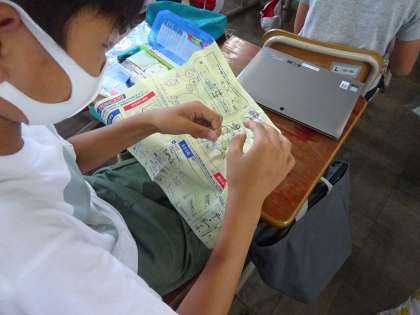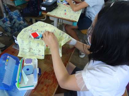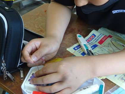 上手にスムーズに進む子もいれば,まだまだ針に糸を通す,玉止め,玉結びに悪戦苦闘中の子も…。