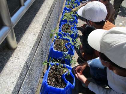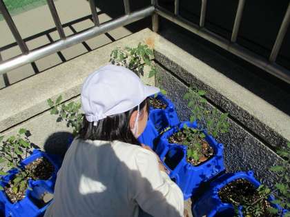 生活科の「ぐんぐんそだておいしいやさい」では,学校で育てているミニトマトの肥料をやりました。毎朝の水やりのおかげで,花を咲かしているミニトマトも多く見られました。中には,はやくも実ができているミニトマトもあります。もっともっと大きくなるようにと願いを込めて丁寧に追肥していました。