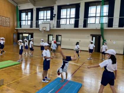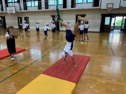 開脚前転や開脚後転,側方倒立回転などの技を連続でしたり組み合わせたりしていくことを目標にやっていきます!また,やったことがない技やできそうな技にも積極的に挑戦していきましょう!