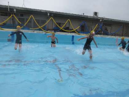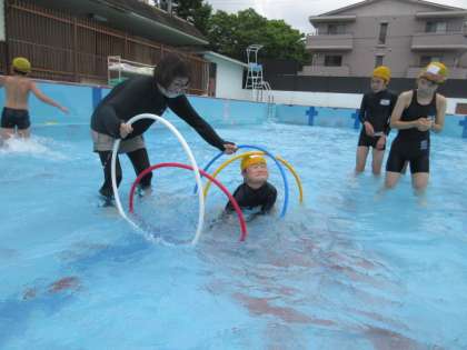 今年度初のプール授業のため,50cm程度の低水位で水慣れを行いました。水中で腹ばいになり「ワニ歩き」をしたり,水の掛け合いをしたり,子ども達は楽しそうに活動をしていました。水温は低めでしたが,子ども達は元気いっぱい遊びました。