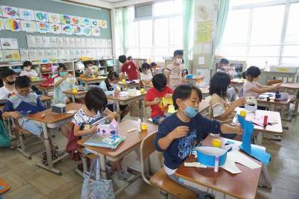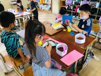図画工作科「わっかで へんしん」の学習では,先週作ったわっかに飾りつけをしていきました。