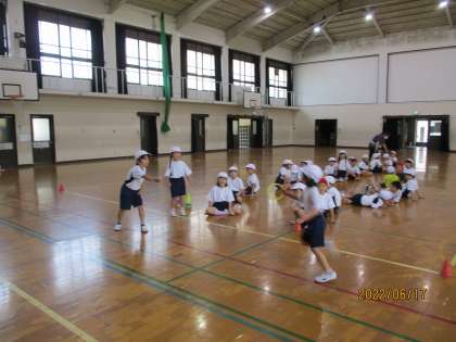 1年生は,みんなでする初めてのリレー。今日はバトンをつなぐこと,みんなの全力でみんなの記録が伸びることを話して練習をしました。