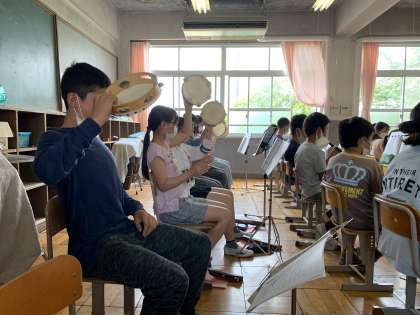 リコーダーとタンブリン,トライアングを使って簡単な合奏をしました。リズムを刻むこともなかなか難しかしい様子でしたが,体を大きく動かし,楽しむ様子も多々見られました。音楽の楽しさが少しずつ…!