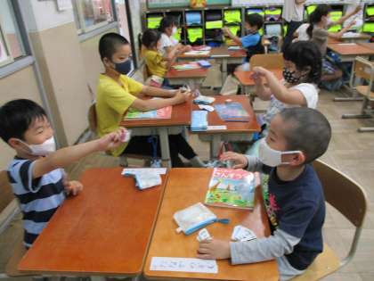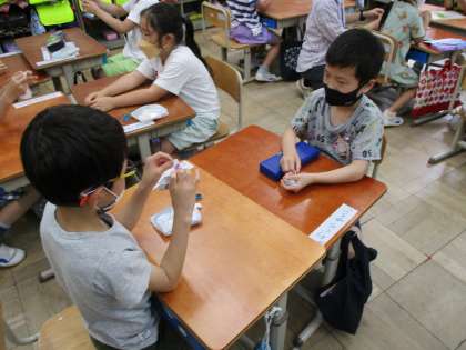 今日の1年生の算数科では,計算カードを使ってクイズを出し合う授業をしました。「答えが7になるのは?」では何通りできるか考えたり,ランダムにとったカードで,足した数の大きさを競ったりしました。