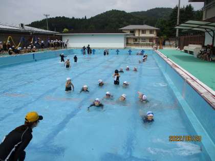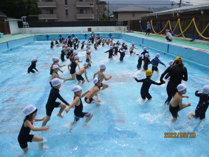 前回に引き続き,生き物の真似をしながら短い距離を歩いた後,プールの中を一列になって歩いたり走ったりワニ歩きをしたりして水慣れをしました。