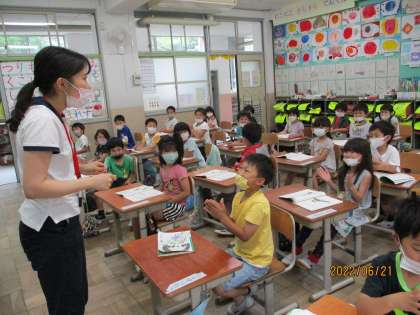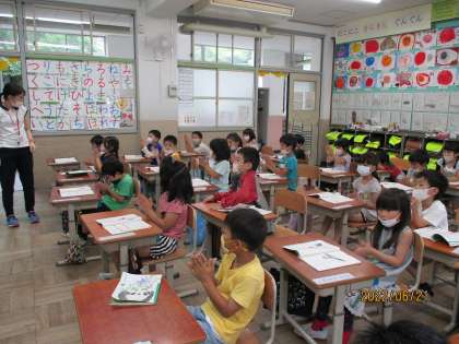 色々な読み方で読むことにチャレンジした後,手を叩きながら,伸ばす音と伸ばさない音の違いに気づく練習もしました。