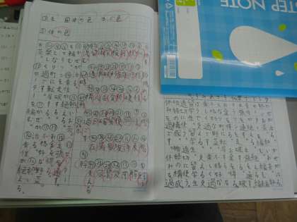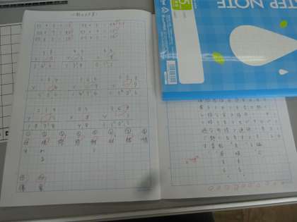 1枚目の写真は,2ページに漢字ドリルの練習,算数の復習プリント,50問テストにむけた学習を取り組んでいる子のノートです。