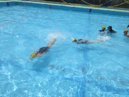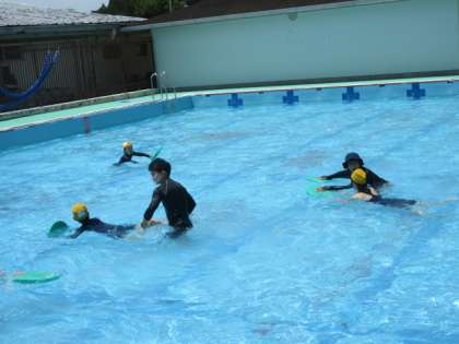 天候に恵まれ,いつもより温かなプールの中で水泳をしました。前半は「ダルマ浮き」「大の字浮き」などの動きから始め,その後は水中で鼻から息を吐く練習や,ブレス等を繰り返し練習しました。