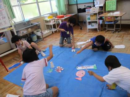 授業の後半は,皆で作った魚を釣堀に見立てたブルーシートへ並べ,魚つりゲームを楽しみました。子ども達の中には,魚ではなくタイヤや富士山を工作した子もおり,みんなで釣り上げて盛り上がっていました。